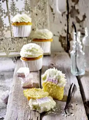 Fill the cream cheese freezing in a piping bag with star-shaped spout. Place 1 marshmallow on each muffin and spray the frosting onto the muffins in a circle. Sprinkle with coconut flakes and refrigerate for at least 30 minutes.