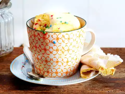 Grease cup with oil. Mix flour, sugar, vanilla sugar, baking powder and salt in the greased cup. Add egg, milk and oil. Stir well with a fork. Fold in confetti sprinkles. Place cup on a saucer.