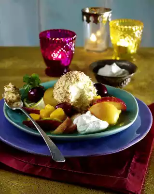Wash and halve the peaches and nectarines, remove the stone and cut the flesh into wedges. Wash and halve the apricots, remove the stone and cut the flesh into quarters. Mix fruit and lime juice. Leave to stand for about 30 minutes. Turn ice cream scoops in roasted coconut flakes. Arrange fruit salad, a blob of yoghurt cream and an ice cream scoop decorated with mint on 8 plates