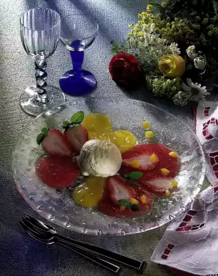 Wash and clean the strawberries. Slice or halve half of the fruit. Puree the remaining berries with the chopping stick. Season with vanillin sugar. Drain the peaches. Cut one half into small cubes. Puree the rest of the peaches and season with liqueur. Arrange one scoop of ice cream on each portion plate. Serve with fruit purees, strawberry halves and slices and peach cubes. Serve decorated with mint