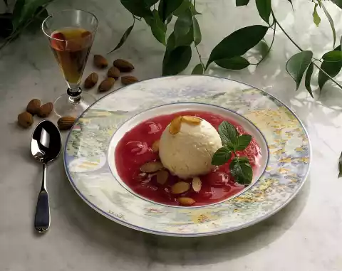 Let it cool down. Roast the flaked almonds in a pan without fat until golden brown. Pour the rhubarb compote onto dessert plates and arrange a vanilla ice cream ball on each. Serve decorated with flaked almonds and mint