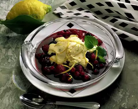 Defrost the berry cocktail. Mix with sugar and allow to soak. Let thaw vanilla ice cream. Wash the lemons, dab dry and peel off some strips from the peel with a julienne chiseler to decorate.