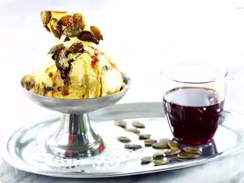 Quickly cut ice cream into slices with a wide pallet or a knife directly from the packaging and layer them alternately with the caramel pieces and pumpkin seed oil in a box shape or a suitable bowl. Press the ice cream a little. Freeze again immediately for 1-2 hours.