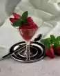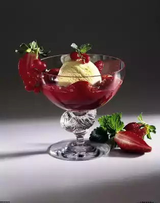 Wash and clean the strawberries and, except for one for garnishing, halve or quarter them. Sort the currants, wash them and remove them from the panicles with a fork. Keep a few panicles for garnishing. Mix the fruit and strawberry sauce. Divide the sauce between two dessert glasses. Place one scoop of ice cream on each and decorate with half strawberry, currant panicle and lemon balm leaves