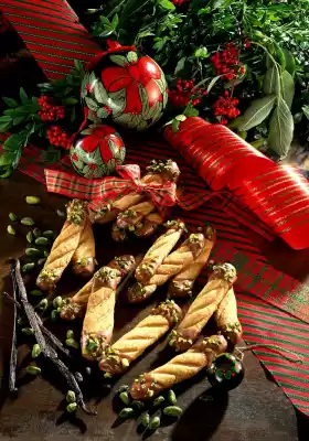 Let it cool down on a cake rack. Melt the chocolate coating. Dip the ends of the vanilla sticks into chocolate coating and sprinkle with the chopped pistachios. Results in about 40 pieces