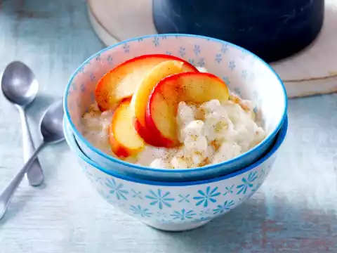Fill rice pudding into small bowls. Spread apple slices on top and dust with cinnamon.