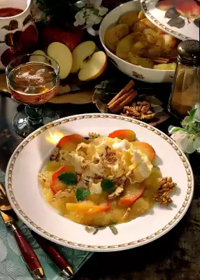Carefully stir in the sauce powder. Chop the walnut kernels. Serve pasta and apple compote garnished with walnuts and lemon balm.