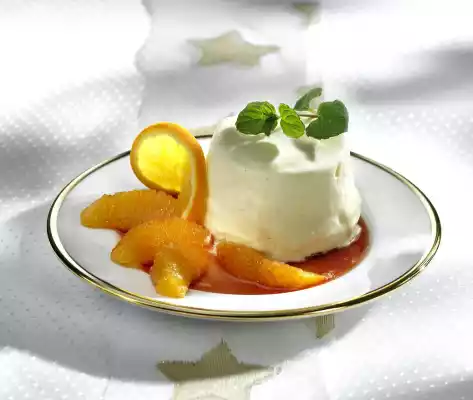 Boil down over low heat for 4-6 minutes. Season with cinnamon and orange liqueur. Remove from the heat, carefully mix in the fillets and let them cool down. Remove parfait about 10 minutes before serving. Carefully remove from the edge of the pan with a knife and turn it over. Serve spicy oranges and one parfait each on plates decorated with mint and orange slices