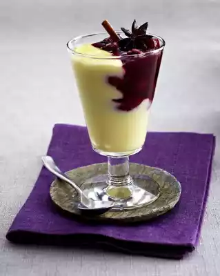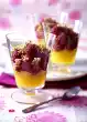 Fill the glasses halfway with pudding. Then spoonfuls of stewed cherries on one side and vanilla pudding on the other