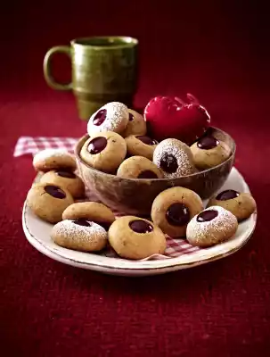 Remove the vanilla crescent pastry from the fridge about 10 minutes before processing. Divide the dough into approx. 45 equally sized pieces and form into balls with your hands. Place them on 2 baking trays lined with baking paper, leaving some space between them, as the cookies will run a little bit apart. Press a little flat and press in small depressions with your index finger