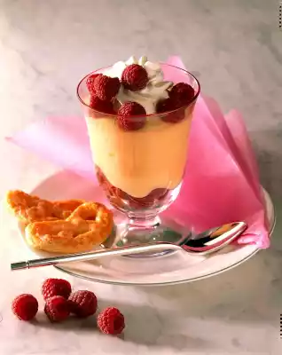 Pour the cream immediately over the fruit and allow to set. Whip cream until stiff and fill into a piping bag with perforated spout. Garnish cream with cream and remaining raspberries. Add two puff pastry biscuits each as desired.