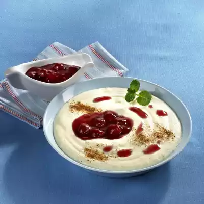 Separate the egg. Beat the egg white until stiff, then pour in 1 tbsp. sugar. Mix egg yolk with 2 tbsp. semolina, then stir into the remaining semolina. Fold in the beaten egg white. Let it cool down if necessary. Serve with the cherries and cinnamon sugar