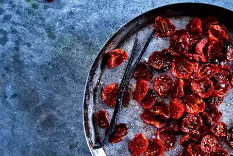 Preheat oven (electric cooker: 150 °C/hot or circulating air: 130 °C/gas: not suitable). Line two baking trays with baking paper. Wash the tomatoes and let them drip off on kitchen paper. In the meantime, cut the vanilla pod lengthwise and scrape out the pulp. Mix with approx. 1 tbsp salt and 1 tsp ginger.