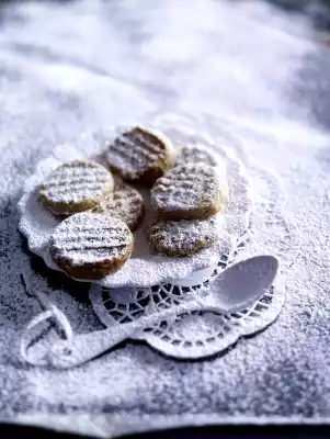Take out, let it cool down on the tray for about 5 minutes. Sieve the icing sugar onto a deep plate and mix with the rest of the vanilla sugar. Turn the cookies while they are still hot. Let them cool down.
