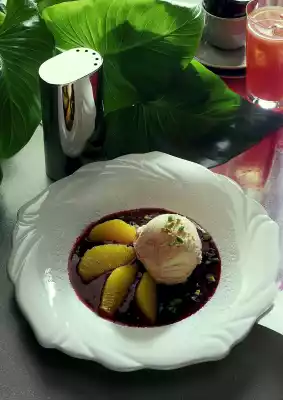 Cut out 4 large balls from the ice cream. Spread the berry puree on 4 plates. Put the ice cream scoops in and arrange the orange fillets around them in a star shape. Sprinkle with the pistachios. Dust the edge of the plate with icing sugar