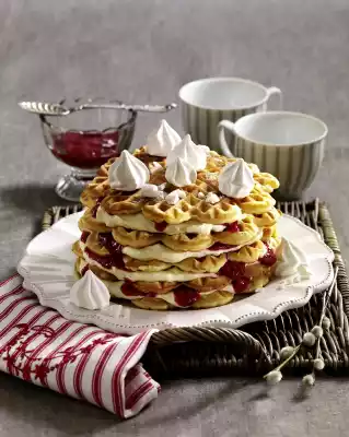 Whip at highest setting for approx. 3 minutes. Spread the cream over 4 waffles, pour about 2 tablespoons of sauce over each. Stack the waffles on top of each other. Finish with the last wafer without cream and chill for 1 1/2 hours. Decorate with meringue. Add the rest of the sauce