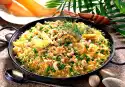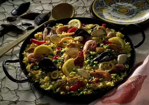 Fry the chicken filet in it until golden brown. Season with salt and pepper and set aside. Add the mussels, prawns and peas to the rice ten minutes before the end of the cooking time and cook in the closed pan.