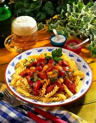 Arrange noodles and sausage goulash on plates. Sprinkle with parsley and garnish.