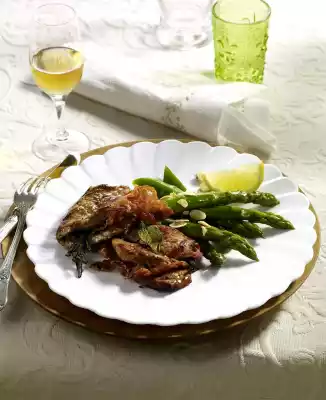 Cover 4 escalopes with rosemary, 4 with sage. Fold the escalopes over and fix them with wooden skewers. Heat oil in a pan. Fry the escalopes for about 4 minutes on each side. Put asparagus in boiling salted water and cook for about 8 minutes.