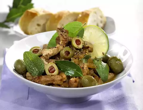 Wash the sage, dab dry and pluck the leaves from the stalks. Add butter to the frying oil in the pan and heat up. Add the onions and fry briefly. Add half of the sage and bay leaves, deglaze with stock and lime juice, bring to the boil and reduce over a low heat for 8-10 minutes. Add olives, season again with salt and pepper. Pour over the meat and serve immediately with remaining sage leaves and, if desired, garnished with slices of lime. Delicious with baguette