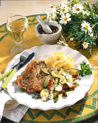 Meanwhile heat 2 tablespoons of oil in a casserole dish, fry the zucchini for 3-4 minutes, turning, and season with salt and pepper. Add the tomatoes, mozzarella and herb butter and warm up briefly. In the meantime, heat the remaining oil in a pan and fry the meat on each side for about 2 minutes over a high heat. Then season with salt and pepper. Drain the noodles. Arrange noodles, vegetables and one piece of meat on two plates and serve garnished with thyme and parsley as desired