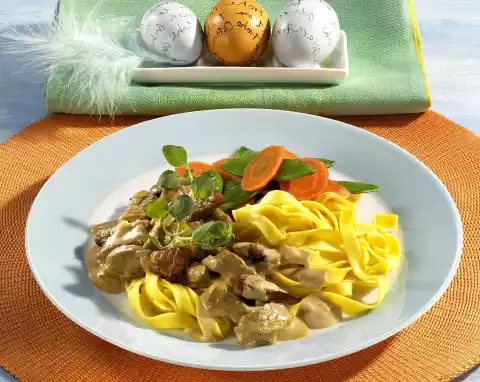 Heat the oil in a coated pan. Fry the meat for about 2 minutes. Fry the onion briefly. Add 100 ml water and bring to the boil. Stir in the stock, cover and stew for about 3 minutes
