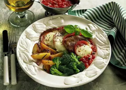 Steam broccoli in little boiling salted water for six to eight minutes. Layer the cutlets with tomato slices and mozzarella in a fan-shaped form in an ovenproof dish and place under the preheated grill for two to three minutes.