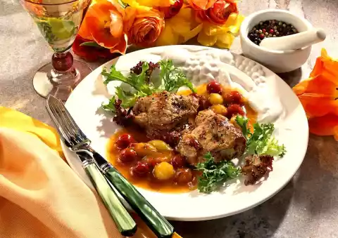 Take the meat out and keep it warm for a short time. Add gooseberries to the frying fat. Deglaze with stock, bring to the boil. Whisk cornflour and some water and thicken the sauce with it. Bring to the boil again and season to taste with salt, pepper and cinnamon.