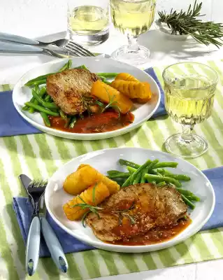 Season with salt and pepper and remove. Add butter to the frying fat. Sweat shallots in it, stir in tomato paste. Deglaze with white wine and stock. Add rosemary and let it boil down for 2 minutes at high heat. Season to taste with salt and pepper. Cutlets, beans, croquettes and some sauce, garnished with rosemary, serve in portions