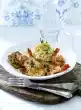 Dab veal escalope dry, cut into thirds and beat flat between 2 layers of foil. Clean and wash the sugar snap peas, cut them diagonally into small pieces. Heat 1 tablespoon of oil in a frying pan, sweat the sugar snap peas in it, remove. Add 1 tablespoon of oil to the pan and fry the meat in portions on each side over high heat for about 1 minute, season with salt and remove.