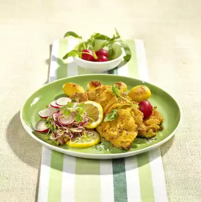 Mix prepared salad ingredients and marinade. Heat clarified butter in a pan. Fry the escalopes in it while turning over medium heat for about 8 minutes. Season with salt, pepper and lemon juice. Fry potatoes in 1-2 tablespoons of hot oil while turning for about 5 minutes. Arrange schnitzel, potatoes and salad on plates. Garnish with lemon, chervil and radish