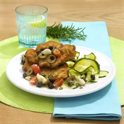 Heat 4 tablespoons of oil in a pan and fry the escalopes in it on both sides for 3-4 minutes. Remove the escalopes from the pan. Heat 1 tablespoon of oil in a frying pan and fry the zucchini briefly on both sides and season with salt and pepper. Melt butter in a pan. Fry the olives, tomatoes and garlic cloves in the butter for about 3 minutes. Add herbs and schnitzel and heat up again briefly. Arrange schnitzel and zucchini on 2 plates and pour olive butter over them