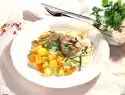 Put the flour, breadcrumbs and egg in a deep plate. Beat the egg and season with salt and pepper. Chop 2 green olives finely and add to the breadcrumbs. Wash the cutlets and dab dry. Turn first in flour, then egg and then breadcrumbs. Heat 4 tablespoons of oil in a pan and fry the escalopes in it on both sides for 3-4 minutes. Remove the escalopes from the pan. Heat 1 tablespoon of oil in a frying pan and fry the zucchini briefly on both sides and season with salt and pepper. Melt butter in a pan. Fry the olives, tomatoes and garlic cloves in the butter for about 3 minutes.