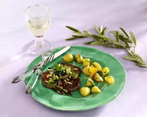 Roast the pine nuts in a pan without fat, take them out. Chop the olives. Wash parsley and shake dry. Pluck the leaves from the stalks and chop them. Mix pine nuts, olives, parsley, lemon juice, salt and pepper and put aside.