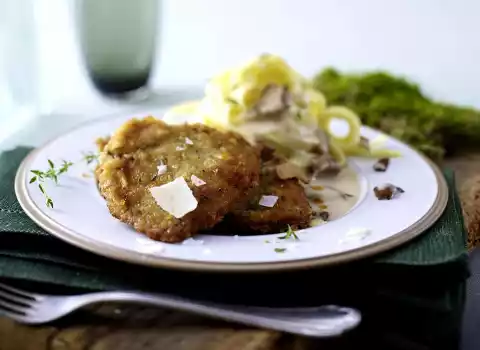 Turn the escalopes one after the other, first in 3 tablespoons of flour, then the egg and finally in the breadcrumbs-parmesan mixture, press on a little. Pour the mushrooms into a sieve, let them drip off and collect the mushroom water.