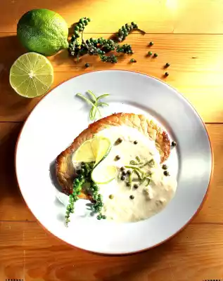 Sauté the onion and fish in the frying oil. Pour on white wine and cream. Bring to the boil and puree with the cutting stick of the hand mixer. Add green pepper and let it simmer for 5 minutes at low heat.