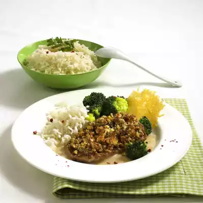 Mix 50 g parmesan, toast, butter, parsley and nuts and season with salt and pepper. Wash cutlets, dab dry, season on both sides with salt and pepper. Heat oil in a frying pan and fry the escalopes on both sides and put them on a baking tray. Deglaze the meat with wine and let it simmer for about 5 minutes. Add stock and cream and thicken with sauce thickener. Cook broccoli in salt water for 8-10 minutes. Melt the rest of the Parmesan cheese in 4 small circles in a pan until the cheese is golden brown. Remove the Parmesan cheese from the pan. Brush the escalopes with the crust and bake under the hot grill for about 4 minutes. Drain the rice. Bring sauce to the boil again and season with salt and pepper.