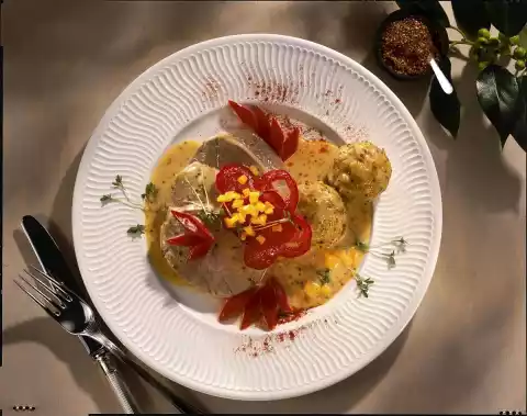 Peel and finely chop the onion. Fry in hot clarified butter. Sweat flour in it. Add milk and veal stock while stirring constantly, bring to the boil. Season to taste with salt, pepper and mustard. Refine with cream. Remove meat from the stock, cut open. Arrange on plates with the sauce and peppers. Serve dusted with paprika rings, cress and paprika powder as desired.