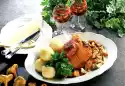 Soak porcini mushrooms in 1/4 litre of lukewarm water for about 30 minutes. Wash veal shank slices and dab dry. Rub with salt and pepper and turn in flour. Heat the oil in a roaster.
