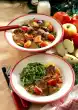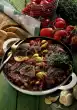 Brown the meat in it. Peel 2 onions and garlic, dice finely and sauté briefly. Add tomato paste, also briefly sauté. Deglaze gradually with wine and 3/8-1/2 litres of broth.