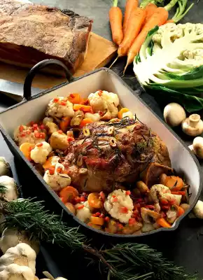 Steam mushrooms in bacon fat for 5 minutes and add to vegetables. Put everything into the roasting pan, mix a little and braise again briefly. Season with salt, pepper and nutmeg. Boiled potatoes taste good with it.