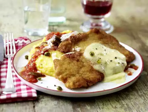 In the meantime, stir butter and the rest of the Parmesan into the polenta. Season to taste with salt and pepper. Chop the anchovy fillets and stir into the tomato sauce with the capers and heat. Serve everything.