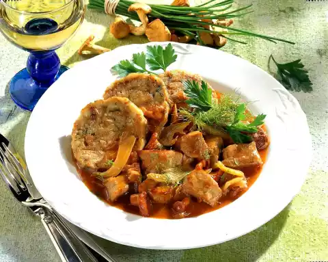 Arrange the veal stew and the napkin dumpling on a plate. Garnish with parsley and fennel green.