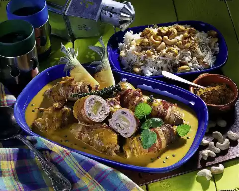 Fix the roulades with wooden skewers. Peel and chop the onion. Heat the oil in a frying pan and fry the roulades thoroughly all around. Add half of the onions, turmeric and about 1 tablespoon curry and fry briefly. Deglaze with 1/8 litre pineapple juice and stock. Add the rest of the green pepper, bring to the boil and braise covered for about 15 minutes. In the meantime heat up the fat in a pot and roast the cashew nuts in it. Add rice, sauté and deglaze with 1/2 liter water. Season with 1 teaspoon of salt and vegetable stock, bring to the boil, cover and allow to swell over a low heat for 15-20 minutes. Remove the roulades from the stew stock and keep warm. Pour cream into the stock, bring to the boil and pour in the sauce thickener while stirring. Bring to the boil again briefly and season to taste with salt and curry.