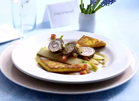 Keep ready polenta corners warm. Heat 1 tablespoon of butter. Fry the asparagus for approx. 8 minutes, turning them over. After 7 minutes frying time add tomato cubes. Season with salt and pepper. Keep roulades warm.