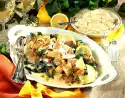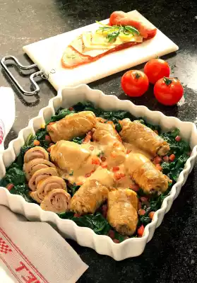 Remove the roulades and keep them warm. Add crème fraiche and bring to the boil. Stir in the sauce thickener and season with salt and pepper. Arrange the roulades on the spinach and add the sauce