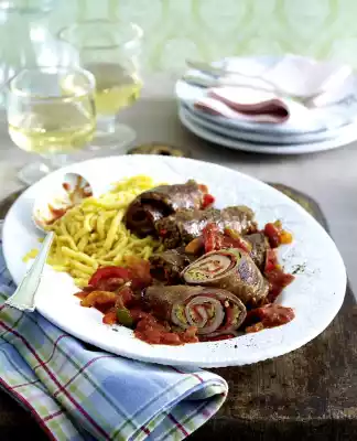 Lightly fry the spaetzle and season with salt and nutmeg. Season the sauce with salt, pepper and paprika powder. Arrange roulades, sauce and spaetzle.