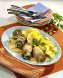 Heat oil. Brown the roulades in it all around. Deglaze with 1/8 litre water, bring to the boil. Stir in broth and possibly saffron and braise covered for 8-10 minutes. Cook the pasta in boiling salted water for about 10 minutes. Wash lemon thoroughly and cut into slices. Remove the roulades from the stock. Bring the roast stock to the boil and thicken. Add lemon slices and simmer for about 2 minutes. Season sauce with salt and pepper.