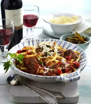 Heat the rest of the oil in portions in a frying pan or casserole. Fry the meat in portions, remove and season with salt. Fry the onions in the frying fat until golden brown, add the meat again. Add wine and 400 millilitres of water. Add tomatoes, laurel, cloves, cinnamon and sugar. Season with salt and pepper. Coarsely chop the tomatoes. Cover and leave to stew for two hours. Cook macaroni in boiling salted water according to package instructions. Drain and let drain. Season sauce again. Serve the pasta with the meat and sauce.