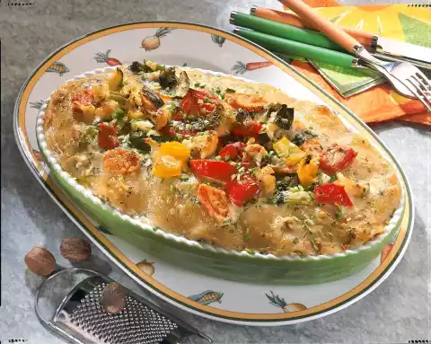 Grease the mould and put a sheet of pasta in it. Spread 1/3 of the vegetable mixture and half of the salami cubes on it. Pour 1/3 of the herb sauce over it. Place the second pasta sheet on top, add another 1/3 of the vegetable mixture and the rest of the salami and pour 1/3 of the sauce over it. Proceed as above with the remaining ingredients. Bake in the preheated oven (electric: 200 °C / gas: level 3) for 40-45 minutes. Wash the chives, dab dry and cut into small rolls. Sprinkle the finished casserole with chives and serve